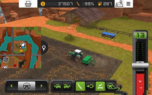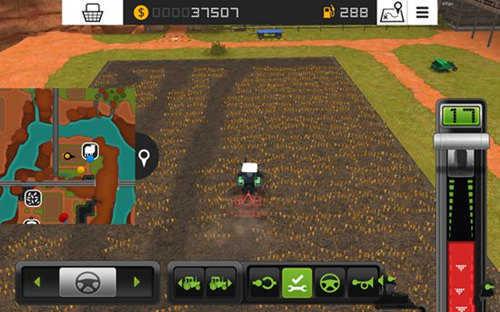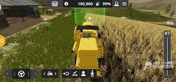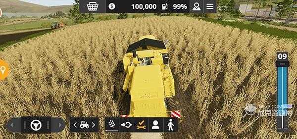 3、这是游戏初期您拥有的田地之一,田里的小麦已经成熟,是时候收割了,使用联合收割机即可收割田里的作物,右侧滑动条是油门,控制前进后退,左侧的方向盘控制左右转弯。