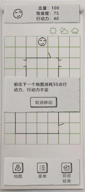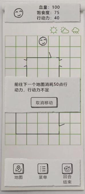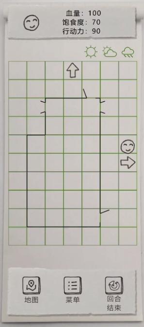 上方是人物的属性,血量为零就会失败,饱食度归零开始掉血量,行动归零就不能在移动了