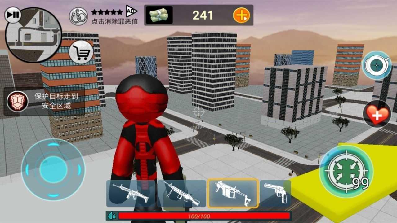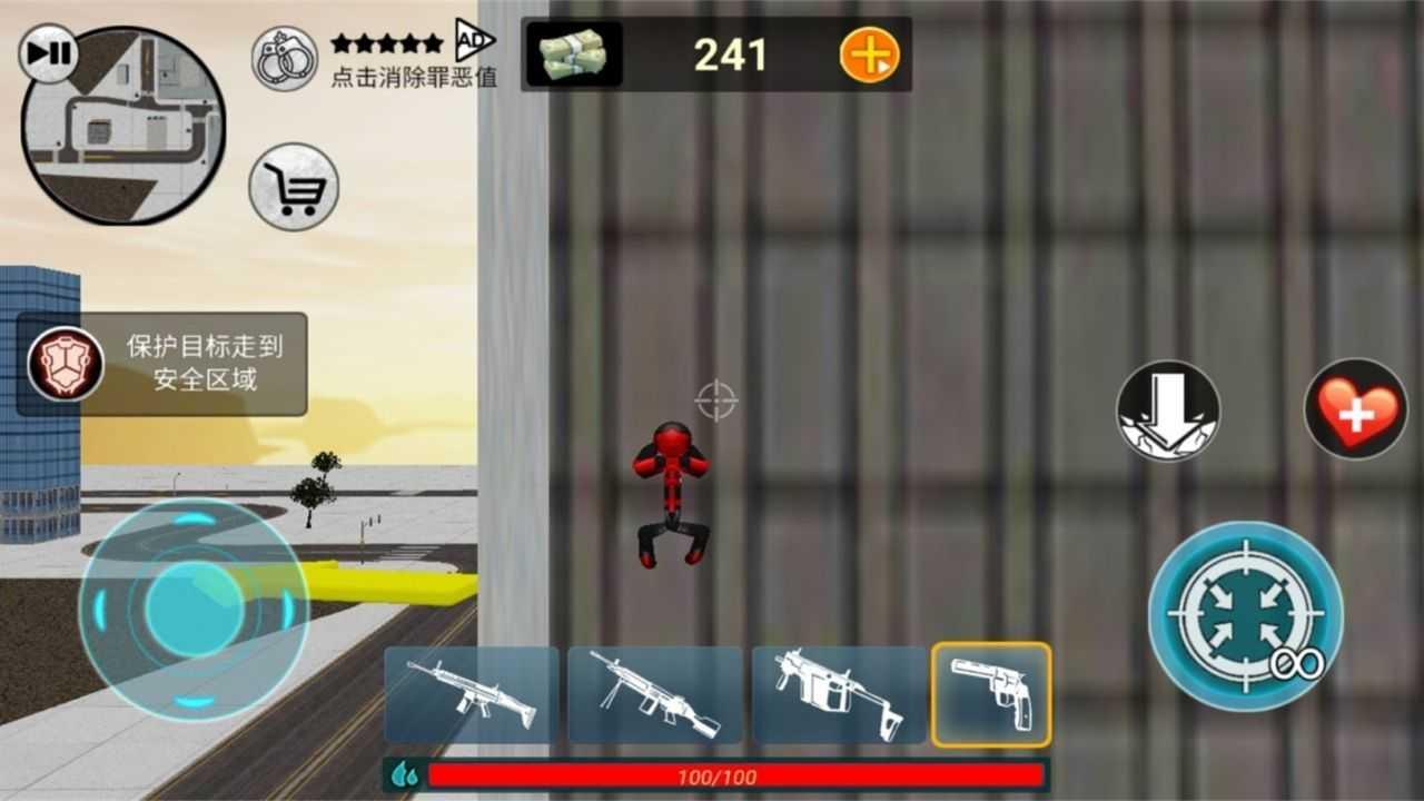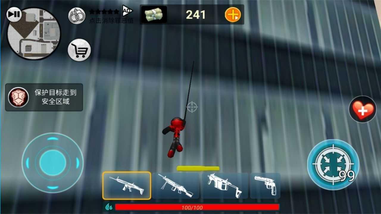 左侧移动、加速,右侧绳索,攻击(跳跃),跳跃,右上侧的武器更换以及血量、经验的显示都实时更新,一览无遗,凭借着大家自由的玩法,与其他帮派的人物进行交火,期间杀人能够获得经验,杀多了会产生星级,警察和其他附近角色会特殊照顾你对你展开火热的进攻,而如何存活,如何将其他人物击杀则是你所需要完成的任务。