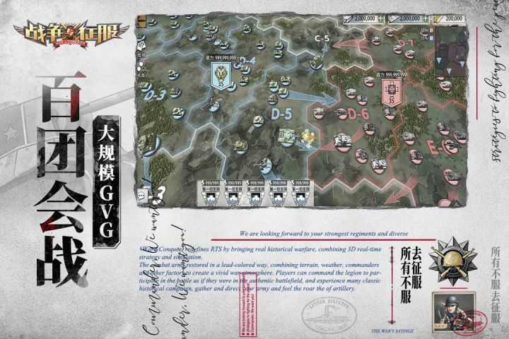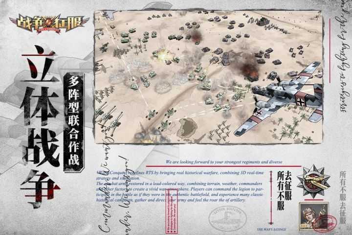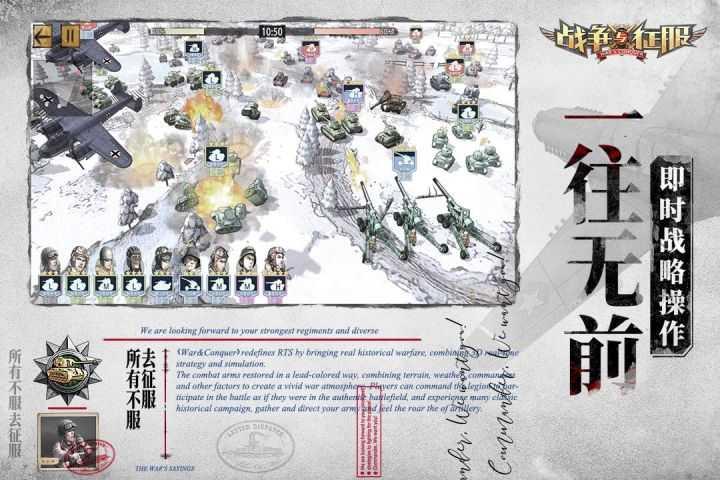 车站会送来源源不断的后勤补给资源,用于玩家整备自己的前线大本营,而更多的资源需要玩家指挥官占领更多战略资源来获取,这将刺激各位指挥官不断进取,夺得胜利。br />亲手打造王牌部队,建立前线大本营,这一切都在《战争与征服》。让我们期待和《战争与征服》一起,去征服,所有不服!