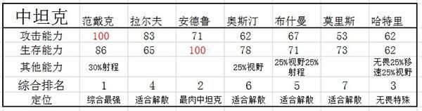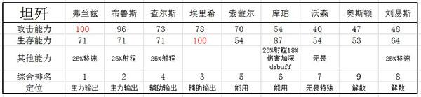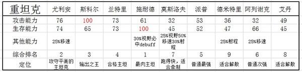 4、好在我的数据并不是主观打分的,而是结合特性和技能实际测算的,经得起横向比较。比如重坦克斯科尔攻击能力100,尤利安攻击能力76,基本可以认为,尤利安在一场战斗中的输出总量为斯科尔的76%。同样,施耐德的生存能力为100,斯科尔的生存能力为65,也就是说斯科尔实际承受伤害的能力是施耐德的65%。