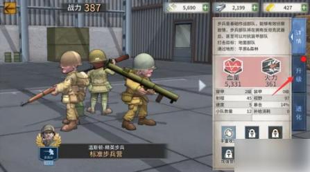 步兵是游戏中基础的作战单位,拥有均衡的机动性、护甲和火力,以及较强的可塑性。初期的步兵可以通过科技树升级,发展为狙击手、反坦克兵、机枪兵等特殊兵种。可谓“万金油”。