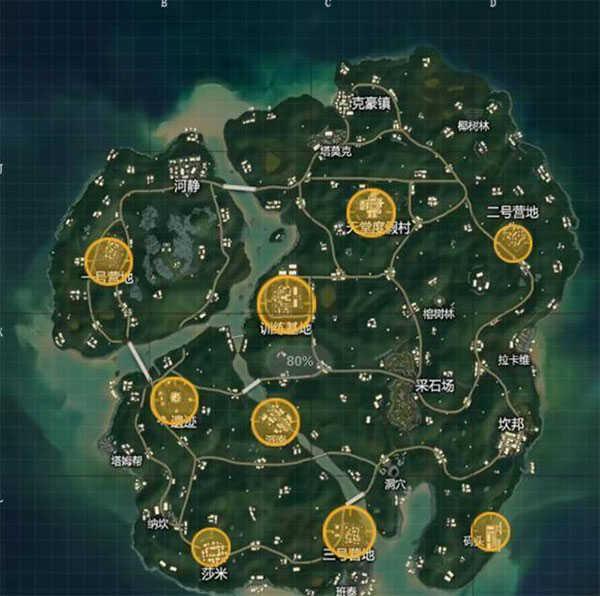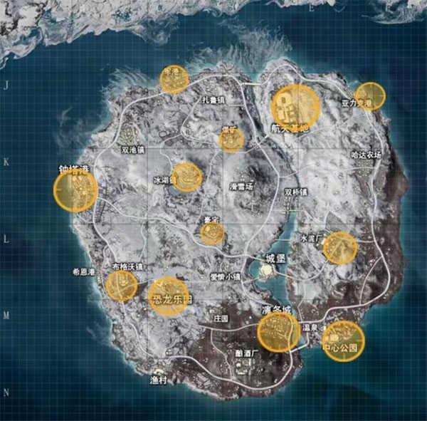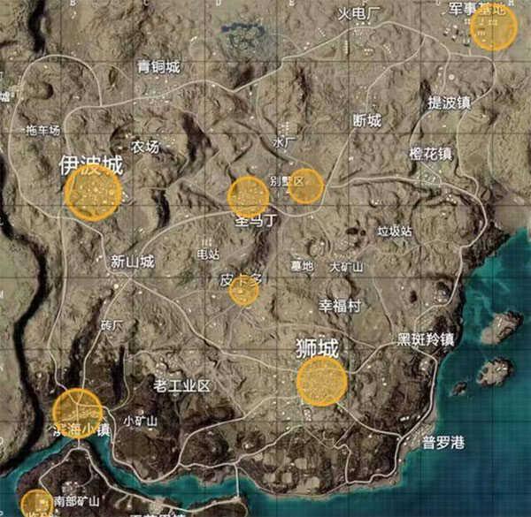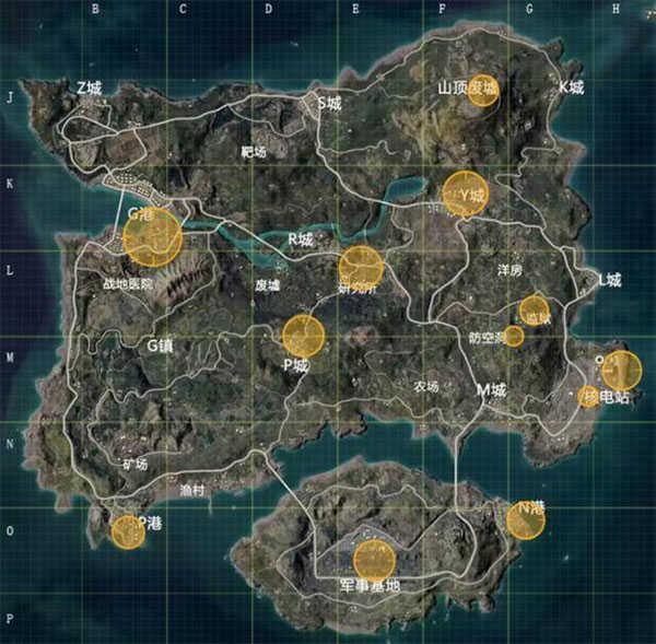 讲完跳伞的技巧接下来给大家分享一下地图的资源分布。图中黄色圈圈标记的地方的是高物资区(PS:高物资区不仅物资多,去的人也多哦)