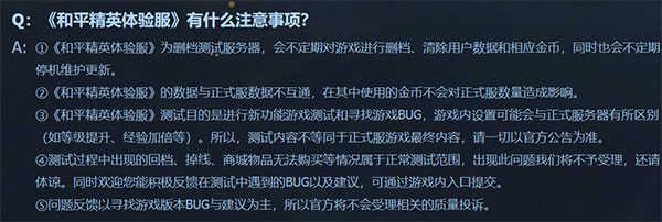 A :《和平精英体验服》无法进行任何充值,但对获得资格的玩家我们将予以一定福利待 遇,凡有资格玩家在《和平精英》体验服中,每人将不定期的获得一定数量金币(具体 数量会根据测试内容而有所调整),以方便玩家体验测试版本的各种新功能。对于经常 官方论坛提交有建设性建议的和第一时间发现重大BUG的用户,我们将给与一定奖 励,部分特别热心,提交BUG较多的玩家还可以获得正式服的各类奖励。