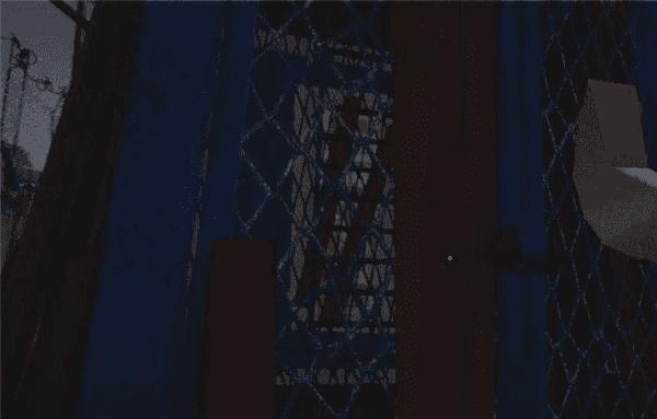 8、出来到院子内,绕道后面用扳手打开蓝色铁栅栏,里面有个梯子。