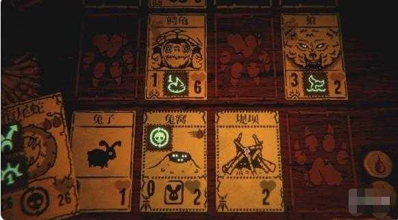 4、门左边的卡牌柜可以用保险箱里的钥匙打开,多周目只用解锁一次。卡牌柜的每个抽屉上都有一个解谜小机关(上下移动卡牌位置使一回合打满5点伤害,很简单),解开后就能打开抽屉获得里面的卡牌,同时触发黑怪对话。注意,抽屉里的卡多周目里只能拿一次,拿取后立即加入当前卡组,以后周目这些卡会在选牌环节随机出现。试玩版里卡牌柜只有两个抽屉,左边放了“石龙子”,右边放了“蚁后”和“工蚁”。但在预告片里一闪而过的牌柜似乎有四个抽屉。