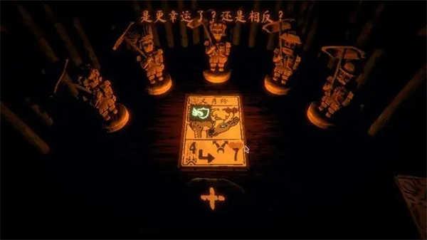 9、三角烛台左侧有一个关在笼子里的狼木雕;门左侧有一个带机关的松鼠木雕,抓着一把匕首;牌桌往左看规则书上有一把鹤嘴镐和一把锤子。推测在正式版里,打败矿工头目后就能获得鹤嘴镐,敲开狼木雕的笼子,然后把狼木雕放到松鼠木雕的机关上,就能获得那把匕首。从规则书上看,匕首应该是作为对战道具,效果类似老虎钳,可以增加天平砝码。在《必牺》里,这个匕首可以挖出主角的眼球作为砝码(挺恐怖的)。