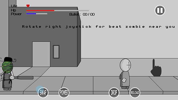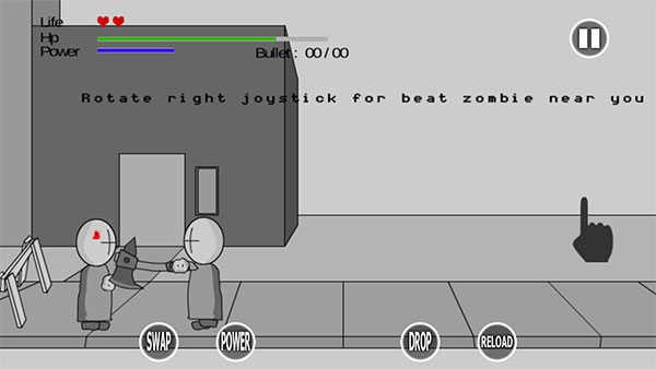 4、进入后左侧屏幕移动蓝色圆圈可以控制角色行走移动,左上角爱心是当前生命值,hp经验,power力气,需要一定时间来恢复,底部是快捷按键,比如Drop就可以释放机械手中所拾取到的武器;