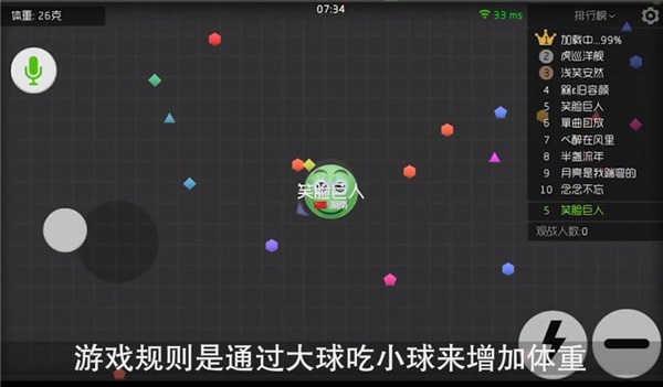 2、游戏规则是通过大球吃小球来增加体重,体重越大排名就越高