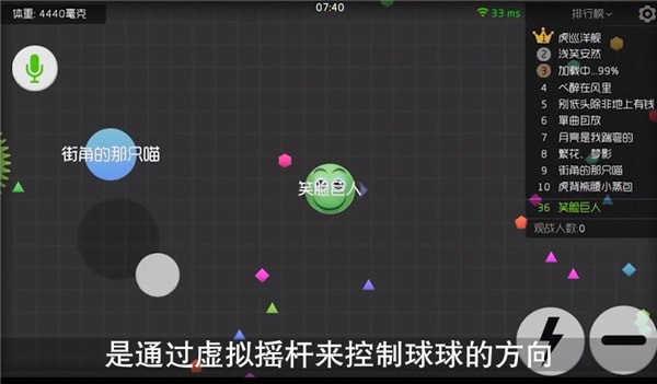 1、首先进入球球大作战游戏对局中,是通过虚拟摇杆来控制球球的方向