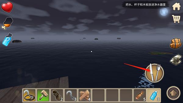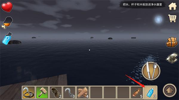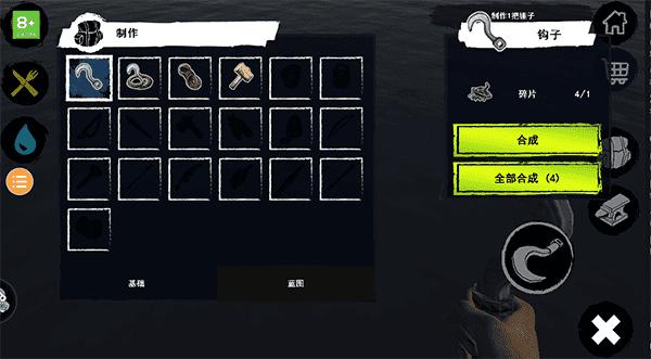 4、但是为了生存,玩家需要扩建我的木筏,必须制作1把锤子,好让我们先钩上来一些物资保存体力。