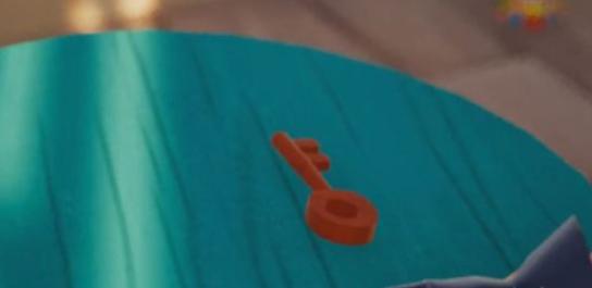 8、拿到蓝色桌子上的钥匙,去往一楼客厅,打开蓝色沙发旁边的黄色门,进入地下室。