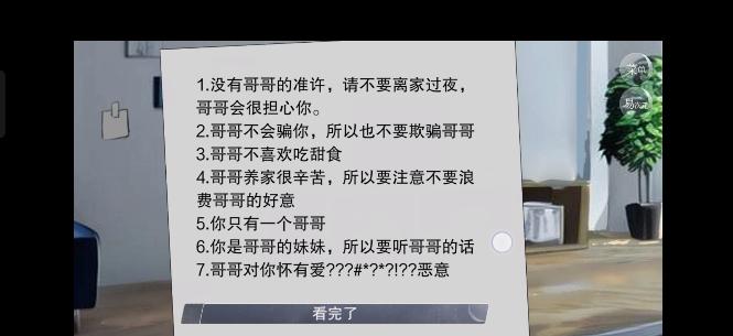 6、来到客厅后先去洗手间,出现红色笑脸后选择离开这里;然后去厨房,查看冰箱,选择“好像是鸡肝和***(忘了)”;再点击电视,看完字条后选择不看;再去哥哥卧室,拿到钥匙后选择继续探索,选择查看书架,选中最右边一本白色的书,然后连续点N次下一页,到最后一页选择“爱意”,亲密度提升,然后继续探索;出来后再次进入哥哥卧室,会有眩晕剧情,选择右边的门(有时限);出来后再点击电视,选择看,会出现隐藏剧情;最后选择大门,出去