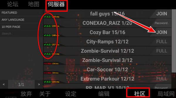 3、通过服务器联机的话,就需要消耗流量了,点击社区,在伺服器中找到适合自己版本的房间,和小伙伴们同时进入即可