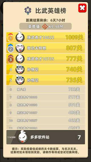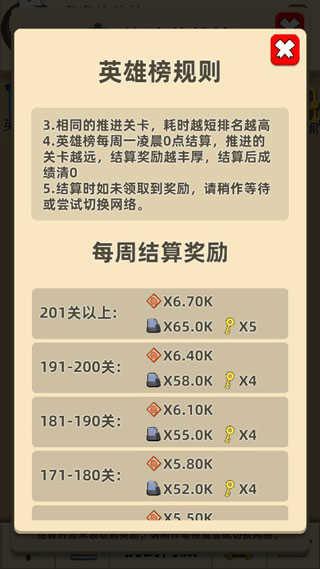 4、英雄榜每周一凌晨0点结算,推进的关卡越远,结算奖励越丰富,结算后成绩清0。