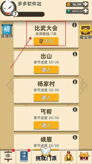 武林大会作为衡量强者的关卡,不单单从装备上,技巧,以及其他元素都会影响你的排名,其中你闯过的关卡越多所占据的排行肯定越发靠前。每日玩家只允许进入3次武林大会,可以在挑战门派中进入。