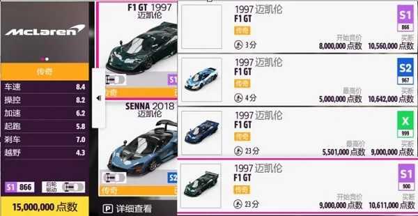 一些在车展标价非常高的车辆,其实在拍卖行的价格相对会低很多。在购买一些较贵车型的时候,可以参考拍卖行的价格。例如在线上和劲敌常见的迈凯伦F1 GT在车展中的价格非常贵,但是到拍卖行中购买可以省下不少钱。拍卖行中一些买断价高达2000万的车,大家平时关注一下季节赛播放列表和马拉松商店,就能省下不少Cr,甚至不花Cr。