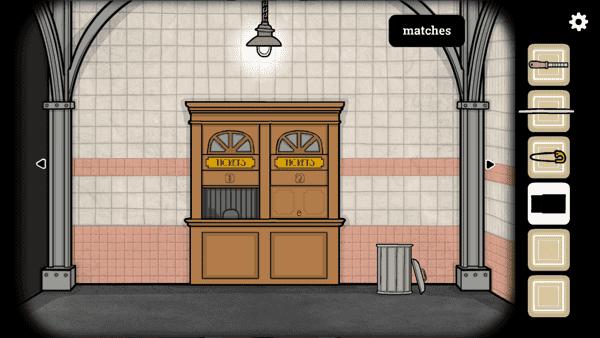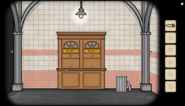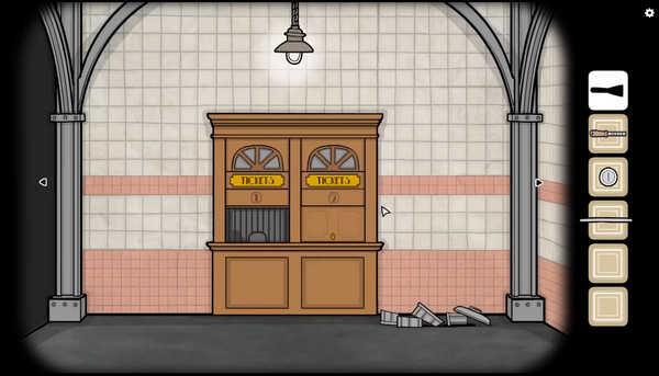10、然后我们去到垃圾桶旁边的售票处,用钥匙开门,用水管敲击门框,叫醒售票员然后和她互动,提示我们需要一枚硬币。