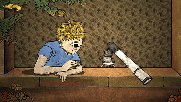 按顺序拖出零件,在支架上组装成望远镜。调节目镜的四个按钮,让看到的画面清晰。(这里哥哥看到了父母带着弟弟外出。)接着“鱼头教”闯进家里,绑架了哥哥