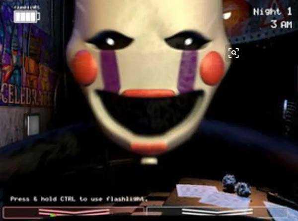一个浑身被拆毁的玩偶,每移动一次会发出信号被干扰的声音,会路过正门,不过正门无危害性,当你在右管道闪灯看见时,立马戴头套,听见噪声和嗵嗵声(应该)代表她离开,若没及时戴头套或她在时开了监控,她会爬到天花板上,一直戴头套可以延缓跳时间,但再所难逃,你也还可以上几次发条,如果时间不是5点还是退了吧;