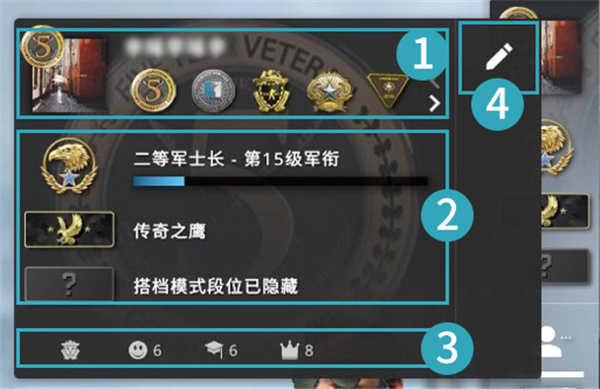 2、位置2:经验军衔、经验等级和经验值、竞技模式段位、搭档模式段位。