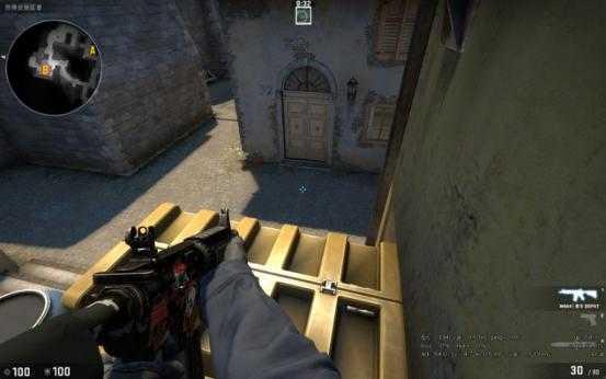 当T进攻B点断后的时候,站这里比贴墙好的原因是因为地图的改动,香蕉道门口两边都可以站人,此时如果对手稍有头脑就会先看右边(图中准星瞄准的地方)再来检查左边,此时你完全可以提前半个身位知道他的动向。