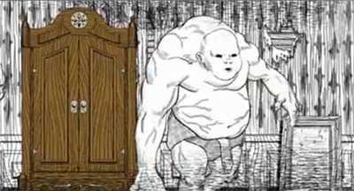 怪物居然穿着尿不湿?!看来这是个男性巨婴。巨婴走开后,出衣柜,向前走不要停,又进地下室。再次看到红红花娃娃。