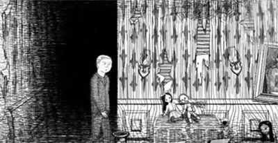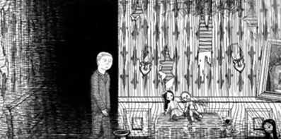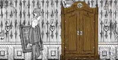 进入地下室,穿过很多洋娃娃的房间,一幅特殊的红色边框女性画, 向前,终于遇到大麻烦,一个巨大的怪物出现,躲进衣柜。