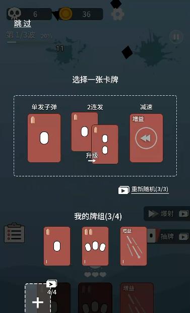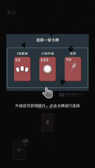 打怪的过程是全自动的,不需要玩家手动控制方向,每隔一段时间,系统都会给玩家三张卡牌,玩家可选其一升级加入自己的卡牌组或者升级技能哦。卡牌组到最大限额四张后,可以选择替换或者升级。