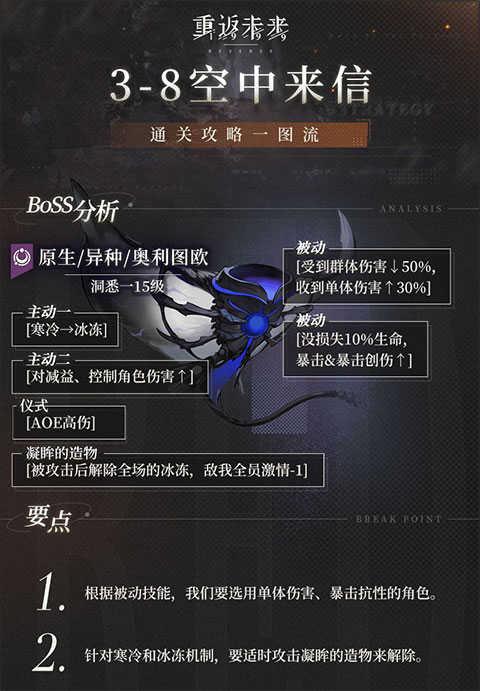 这个关卡非常难以处理的地方就是boss,所以想要通关,必须要知道boss的特点。Boss的名叫奥利托欧,是一个原生属性的异种,所以被兽属性的英雄所克制。所以在面对这个boss时,玩家尽量选用拥有兽属性的英雄来对抗。