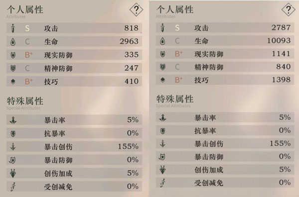 先来比一下个人属性:左侧是狼群1级的面板,右侧是狼群洞悉一30级的面板。