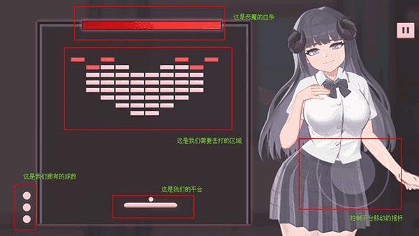 这就是我们的游戏界面了,我们初始是有3个球的,我们需要击打上面的砖块来消耗恶魔的血量,当恶魔血量归0,我们也就成功了,我们当我们击打砖块后,球会反弹,然后根据万有引力的原理进行下落,我们要做的就是控制平台接住球,让它重新去打砖块,恶魔在掉血的时候也会发生一些变化,小编在这也就不细说了。