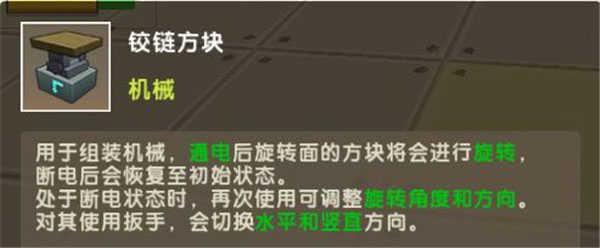 铰链方块只能用在机械中才会生效,通电后旋转面的方块会进行旋转。装在铰链方块旋转面的方块会被带动旋转,在飞行载具中,铰链方块可以用来带动机翼或者尾翼旋转,同时,用扳手点击铰链方块可以切换旋转方向。