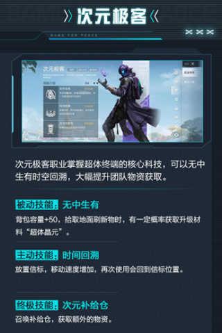 次元极客职业掌握超体终端的核心科技,可以无中生有时空回溯,大幅提升团队物资获取。