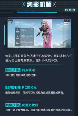 绚彩机师职业角色沉迷于机械设计,可以多种方式使用自己的专属载具,提升小队战斗力。