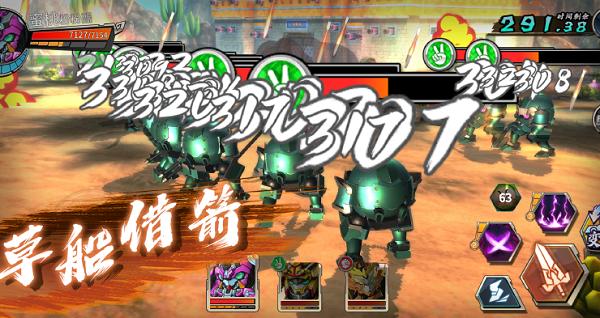 果宝三国中经典的诸葛亮草船借箭,在游戏中变成了一次性大范围箭雨AOE,对大量敌人造成密集伤害。