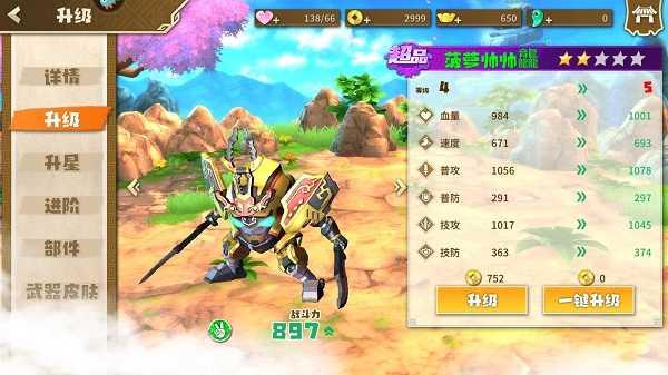 6、使用金币可以为机甲升级,使用碎片则可以让机甲升星。两者虽然都可以提升机甲战力,但升星的幅度远比升级的来得高。
