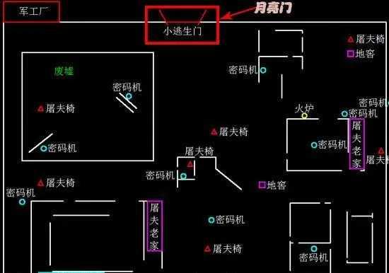 军工厂大家比较熟悉,两个门的位置基本成面对面的方向,而其中一扇逃生门我们称之为”月亮门“只要朝着月亮的方向走,就能找到门的位置。