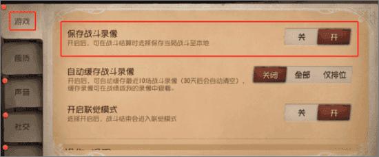 2、在游戏设置界面,选择游戏一栏,下滑找到保存战斗录像功能,选择打开。之后会弹出自动缓存战斗录像一栏,可以选择全部自动录制,或者是仅自定录制排位赛。