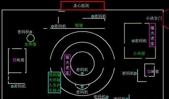 圣心医院两个大门前都有显著的建筑物标识,一个逃生门前正好面对的是医院阳台里的密码机刷新点,玩家可以在解完密码后直接爬窗直走,去开大门。