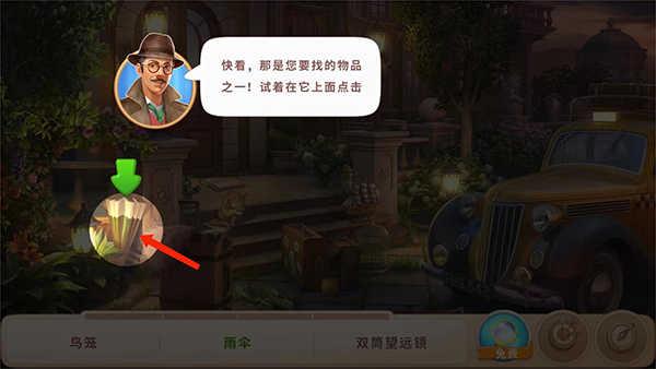 7、这次是寻找物品的游戏,需要在当前界面找到、鸟笼、雨伞和双筒望远镜,