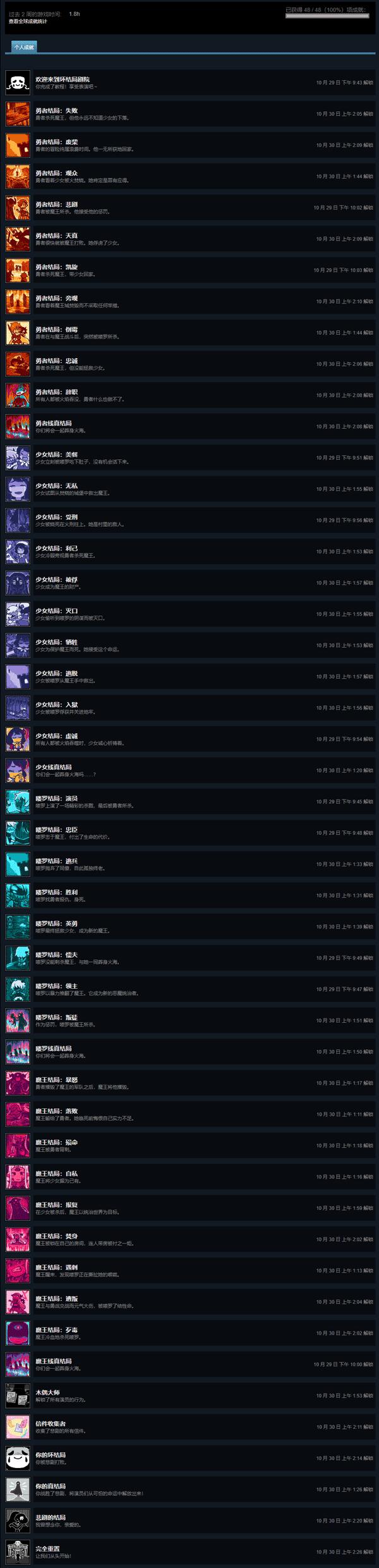 注意:如果你还从未开始游玩这款游戏,那请不要看这部分内容,成就的描述十分剧透,等你打到几个真结局后再来吧。