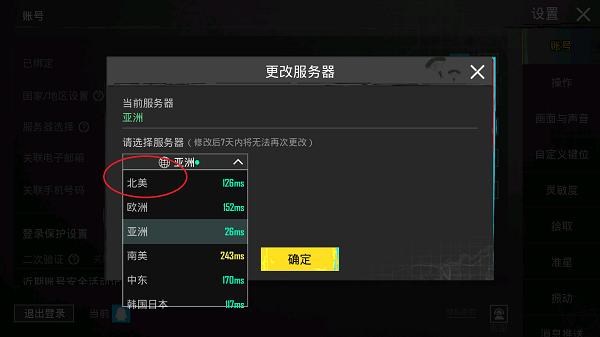 3、点击服务器选择,可进行服务器修改,选择"北美"即可,此外还有亚洲、欧洲、中东、韩国、日本多个服务器。