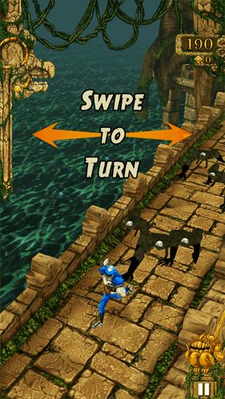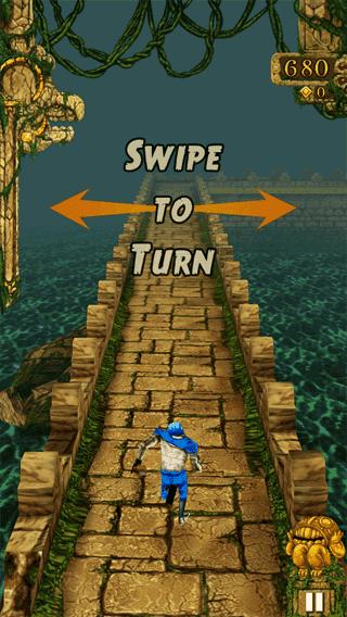 神庙场景如果在不该转弯的时候转向两侧,就会减速,使怪物追上。板桥场景如果转向两侧就会掉下。石头路的场景不仅提前转弯会调下,左偏或右偏过多也会掉下。