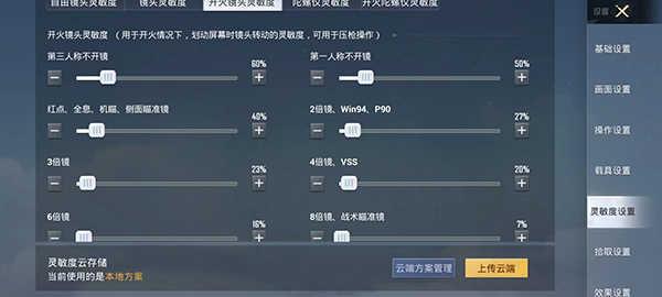 灵敏度是一个你控制角色画面转换时的重要元素,调太高滑动画面时会过快,太低又会过慢,所以一个合适自己的灵敏度对手感的提升是很重要的。 在灵敏度设定界面,为保持一致性,我在镜头灵敏度和开火镜头灵敏度是相同的设定。 我个人感觉比较有手感的设定是红点和2倍镜50—60%,3倍镜20—25%,4倍10%,6倍8%,和8倍6%,大家亦可以根据自己手感去微调。 手感很重要,能不能吃到鸡,就靠它了。
