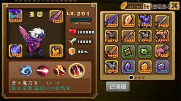 主界面上最高端大气上档次的城堡就是英雄殿堂啦!这可是专属亚瑟的豪华驻地,所以进入英雄殿堂这里面会显示主角各种信息。界面左侧显示主角形象、装备信息、主角等级、生命值、攻击力、防御力,以及主角已经开启的各种技能。界面右侧相当于背包功能,这里是已经获得的各种装备。主角总共可穿戴4键装备,双击背包右侧的装备就能让主角穿上装备。初始开启的背包只有8格。单击背包里面的装备会在下面显示强化或者出售