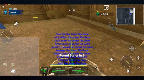 5、玩家可以利用虚拟键盘控制角色移动,右下方的按键可以进行射击、换弹、半蹲、趴下等多种功能;