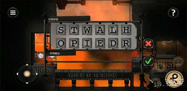 展开字母盘组成SOILD结实的,跳到单词上,向前注意跳跃的时间跳过火堆,跳下去后在左边组成LIE谎言,小人会将怪物拦住组成LOVE爱成为保护罩,HERO推着向前。