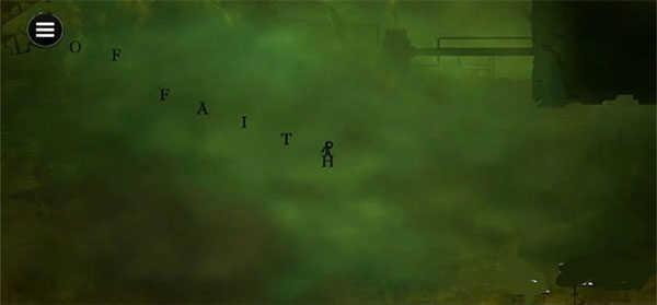 4、跳下台子出现一个小人将左侧的单词组成FEAR害怕,变成敌人追击HERO。逃走后跳下悬崖,会出现字母保护HERO不掉下去,空中的字母组成OFFAITH,跳H上时不要行动,HERO自己跳上平台,发光的小人接住它保证他安全着地。