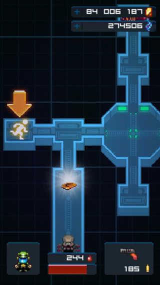 每当我们击杀一个房间的怪物后,若是这个房间还有其他相邻的房间就会显示出来,不过不是所有的房间中都是怪物,有的房间中会出现宝箱之类的东西,点击打开可以随机获得金钱,子弹或者武器等东西。当我们击杀某个怪物后旁边的房间中出现一个小人奔跑的图标,就意味着我们找到了出口,这时候我们就可以根据自己的剩余血量值做出选择,血量值多的话就继续寻找其他有怪物的房间,全部击杀后再点击出去,血量少的话直接出去就可以了。